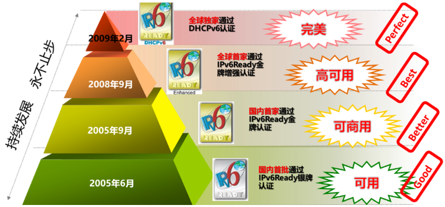 MGM美高梅官网是国内首个顺利获得IPv6 Ready Phase2 认证的网络厂商,也是全球首个顺利获得IPv6 Ready Phase2 Enhance认证的网络厂商,还是全球最早顺利获得DHCPv6认证的网络厂商。